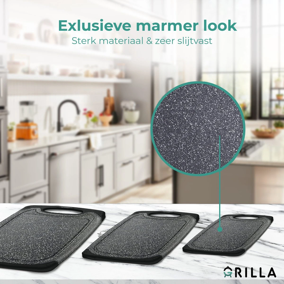 een kleine snijplank voor fruit, een middelgroot bord voor kleine hak en snijtaken en het grote bord tijdens het bereiden van feestmaaltijden. Voor elke gelegenheid de perfecte snijplank zo bij de hand!