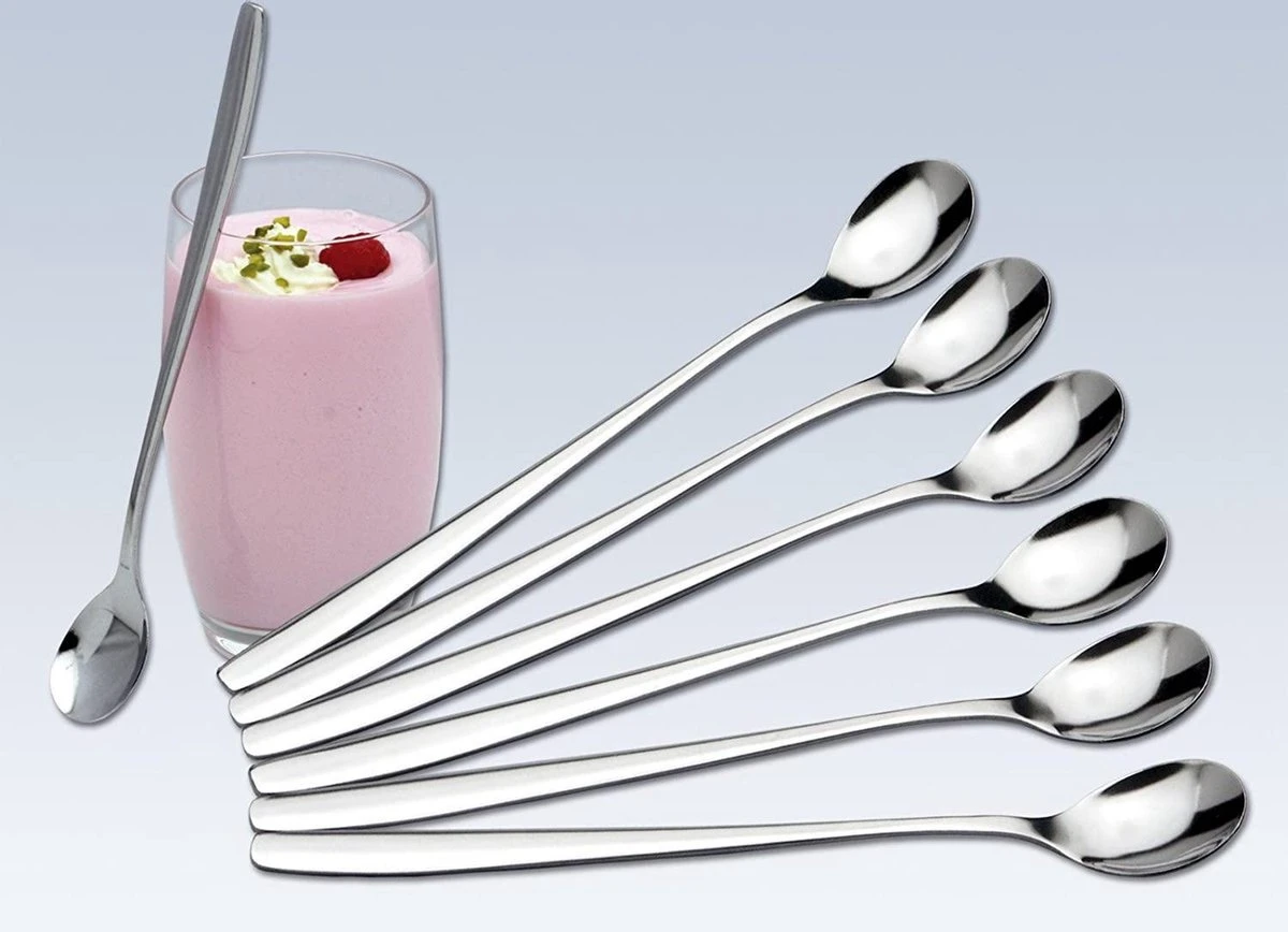 Set van 6 roestvrijstalen Latte Macchiato lepels. Handig om in lange glazen te roeren of uit te scheppen.